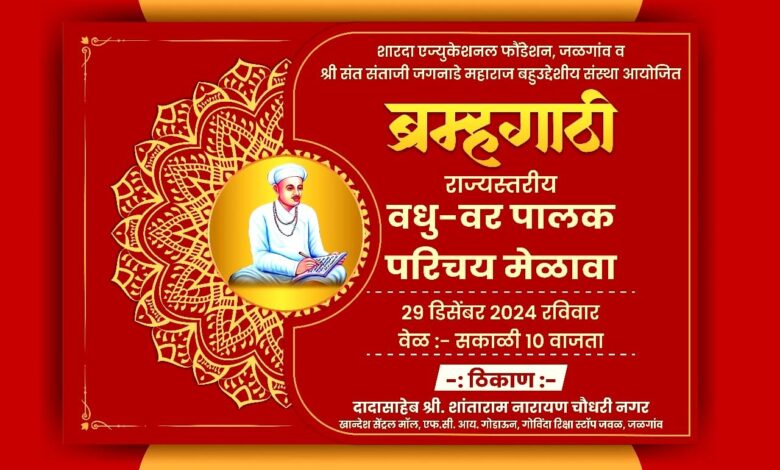 दरवर्षीप्रमाणे शारदा एज्युकेशनल फाउंडेशन आयोजित श्री संत जगनाडे महाराज महाराज बहुद्देशीय संस्थेतर्फे राज्यस्तरीय वधू-वर व पालक परिचय मेळावा यंदाही मोठ्या उत्साहात घेण्यात येत आहे. हा मेळावा रविवार दि.२९ डिसेंबर रोजी सकाळी ९.३० वाजता दादासो शांताराम नारायण चौधरी नगर, खान्देश सेंट्रल मॉल परिसर, जळगाव या ठिकाणी होत आहे. विवाहेच्छुक तरुणांनी, समाजबांधवांनी नोंदणीसाठी चांगला प्रतिसाद दिला आहे.