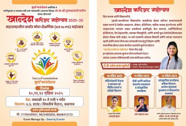 | लोकमाध्यम न्यूज जळगांव दि.१० :खान्देशातील विद्यार्थी, युवक आणि स्पर्धा परीक्षेच्या तयारीत असलेल्या विद्यार्थ्यांसाठी सुवर्णसंधी निर्माण करणारा “खान्देश करिअर महोत्सव” दि.१०, ११ व १२ एप्रिल रोजी जळगाव येथे आयोजित करण्यात आला आहे. सुर्या फाऊंडेशनतर्फे आयोजित महोत्सवाला पालकमंत्री ना.गुलाबराव पाटील यांचे विशेष सौजन्य लाभणार आहे. विविध मान्यवरांच्या उपस्थितीत शिवतीर्थ मैदान, जळगाव येथे हा महोत्सव भव्य स्वरूपात पार पडणार असून खान्देशासह राज्यातील हजारो विद्यार्थी आणि पालकांना याचा फायदा होणार आहे.