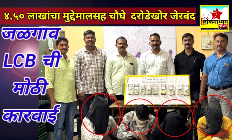 | लोकमाध्यम न्युज जळगाव | दि.१९ सप्टेंबर २०२५ : स्थानिक गुन्हे शाखेच्या पथकाने रेल्वे प्रवाशाला मारहाण करून लुटलेले ४ लाख ५० हजार रुपये रोख हस्तगत करत मध्यप्रदेश व जळगाव जिल्ह्यातील सराईत दरोडेखोरांच्या टोळीतील चौघांना जेरबंद केले आहे. तर या प्रकरणातील एक आरोपी फरार असून त्याचा शोध पोलिसांनी सुरू केला आहे.
