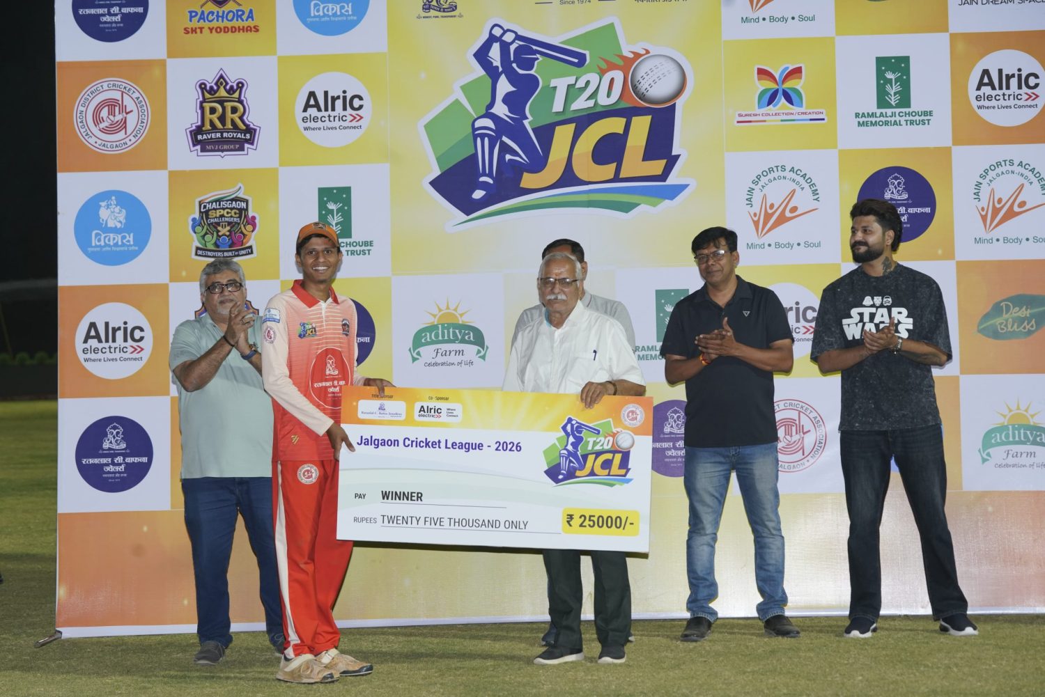 जळगाव जिल्हा क्रिकेट असोसिएशनच्या वतीने आयोजित रतनलाल सी. बाफना ज्वेलर्स प्रायोजित व अलरीक इलेक्ट्रीकल्स सहप्रायोजकत्वाखाली जळगाव क्रिकेट लिग लिग-२०२६, JCL T-20 स्पर्धेतील सर्व सामन्यांमध्ये उत्कृष्ट कामगिरी करणाऱ्या खेळाडूंसह वैयक्तिक कामगिरीसाठी चॅम्पियन्स, (विजेता), उपविजेता, ३rd प्लेस, ४th प्लेस, फेयर प्ले पुरस्कार, प्लेयर ऑफ द लीग, उत्कृष्ट फलंदाज, उत्कृष्ट गोलंदाज स्पर्धेतील सगळ्यात अधिक षटकार, स्पर्धेतील सगळ्यात अधिक निर्धाव चेंडू,